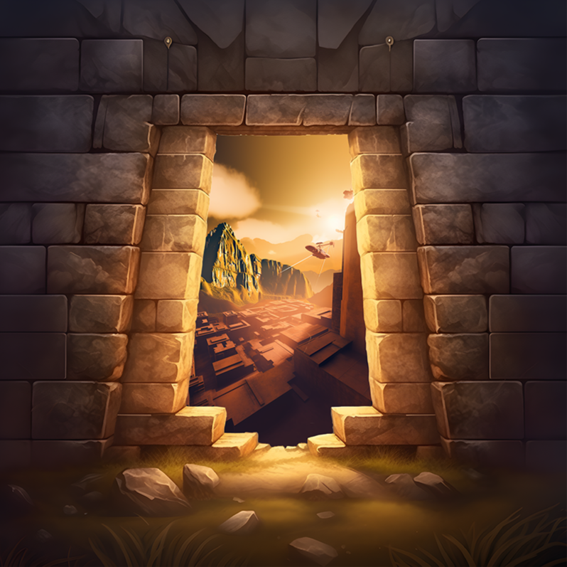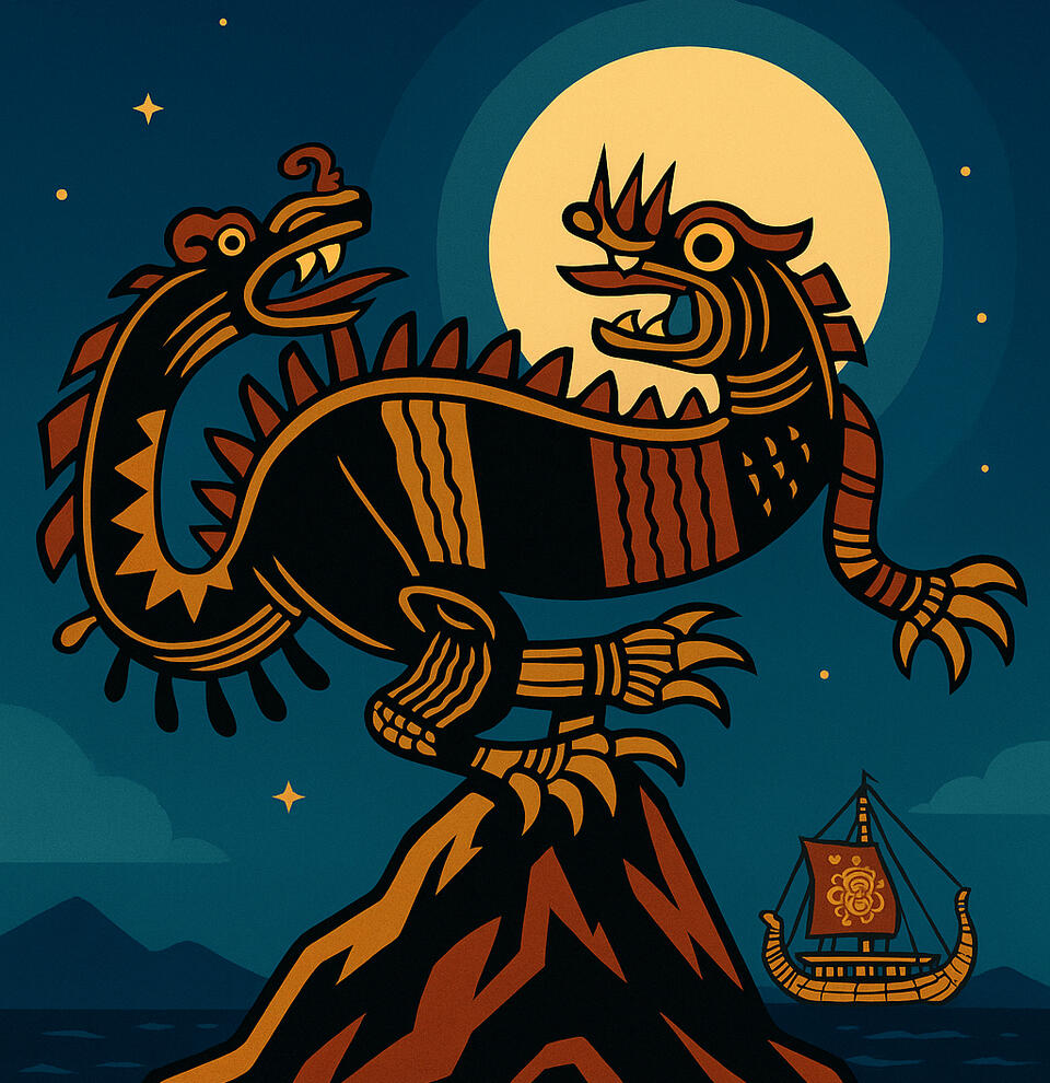 Huaca del Dragón Arcoiris | Lugar | Templo adornado con arcoíris y dragones bicéfalos que guardan un tumi brillante. Espacio de abundancia y equilibrio natural. |