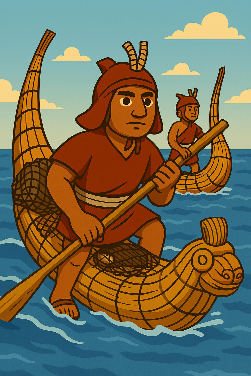 Pescador Moche | Personaje | Conocedor del mar. Usa caballitos de totora, redes y anzuelos para pescar y recolectar conchas sagradas. Hace ofrendas a los dioses marinos. |