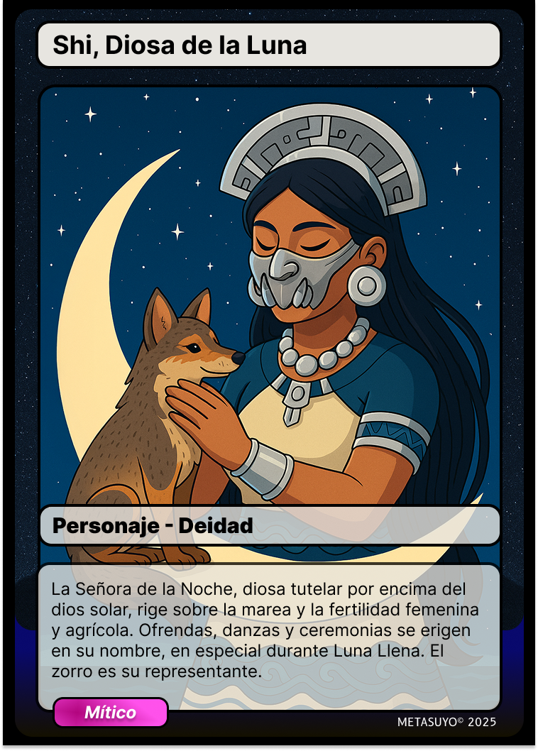 Shi – Diosa de la Luna | Personaje | La Señora de la Noche, diosa tutelar que rige la marea y la fertilidad. Se le dedican ofrendas y danzas, especialmente en luna llena. El zorro es su representante. |